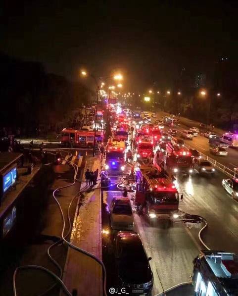 .截止11月28日0時(shí)30分,艮山西路66號(hào)一汽配倉庫火災(zāi),明火已基本得到控制,現(xiàn)場(chǎng)仍有消防車50余輛,消防官兵仍在奮力撲救,盡最大努力減少財(cái)產(chǎn)損失。圖為由于路窄車多,消防車很難進(jìn)入火場(chǎng)核心