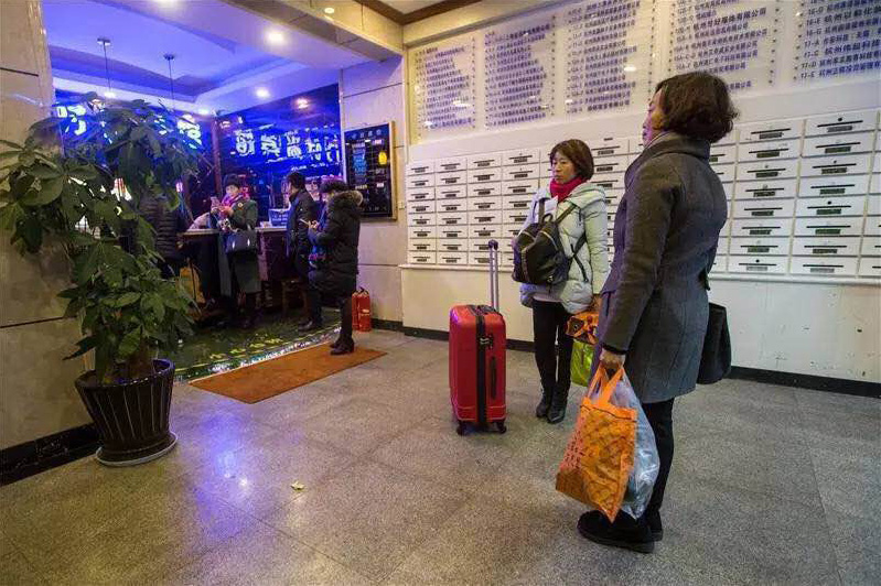 .東門大廈這邊有兩個(gè)酒店:東門賓館和布丁酒店。晚上8點(diǎn)多,住客都被叫起來?!百e館把我們趕下來了,說火勢(shì)太大,怕蔓延過來?!辈级【频暌粋€(gè)年輕女孩蹲在大門旁邊,呆呆地看著來來往往的行人。她實(shí)在無聊,便抽起了煙。圖為緊鄰火場(chǎng)的一家賓館,住客紛紛退房離開。