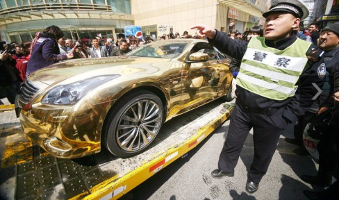 2011年3月29日,一輛車身鍍金的“黃金跑車”停在南京一商場門口,車主停好車后隨即離去,過了約10分鐘,“黃金拖車”被交警以違章停車拖走。